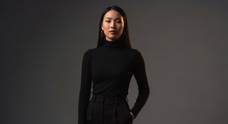 Portrait of a beautiful young asian woman in black clothes on gray background