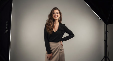 Beautiful young woman posing in studio, looking at camera and smiling