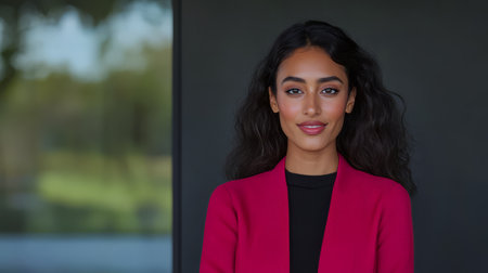 A smiling woman stands confidently in front of a modern building. She wears a vibrant red blazer over a black top. Natural light enhances her features as she gazes directly at the viewer.