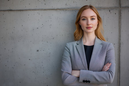 Business professional poses confidently against a textured wall in a bustling city setting.