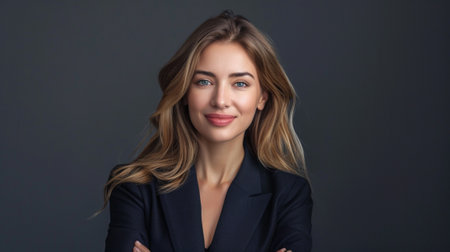 A woman stands confidently in a tailored black blazer and white blouse posing against a dark background. Her long hair cascades down showcasing an elegant professional look.