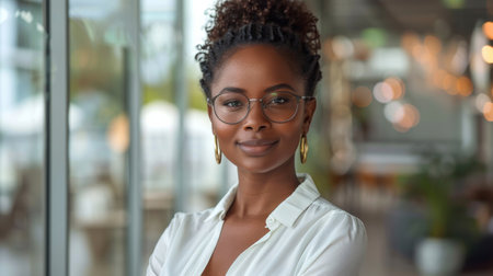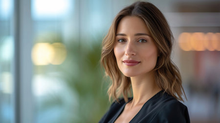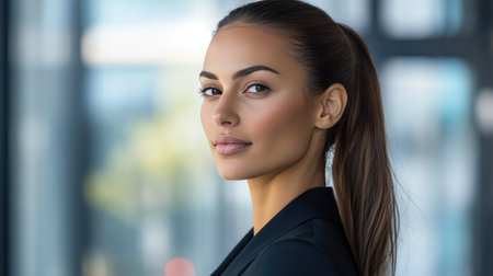 A confident businesswoman stands in a modern office space, her poised and professional demeanor reflecting leadership and ambition