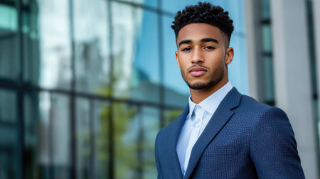 A confident young man in a stylish suit poses against a modern urban backdrop. This professional portrait captures his serious demeanor and contemporary fashion.