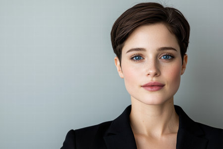 Woman wearing a dark jacket, looking confidently at the camera. She has short, neatly styled hair and subtle makeup. The lighting highlights her facial features against a plain background