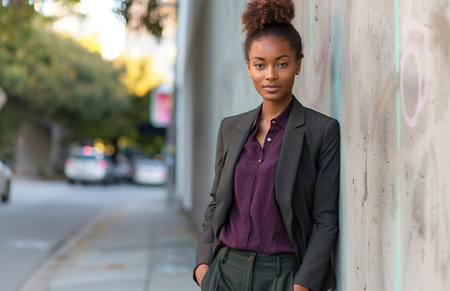 A young professional woman stands confidently on a bustling city street.