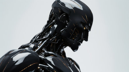 A modern robot with a shiny black and orange exterior stands confidently, highlighting its high-tech design elements.