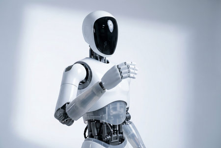 A humanoid robot with intricate details stands in a clean, minimalist space, highlighting its design.