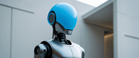 AI Generated. A robot with a blue helmet is standing in front of a building