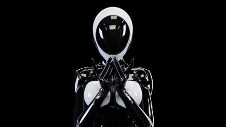 A robotic figure stands against a gray background, its white and black metallic body exuding a futuristic aesthetic