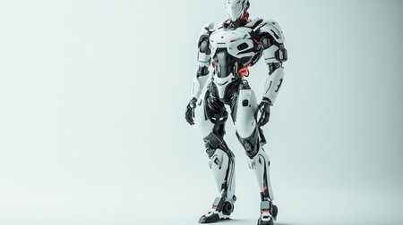 Futuristic humanoid robot with white and black design stands in bright environment. Detailed mechanical parts and sleek body represent advanced technology and robotics concept.