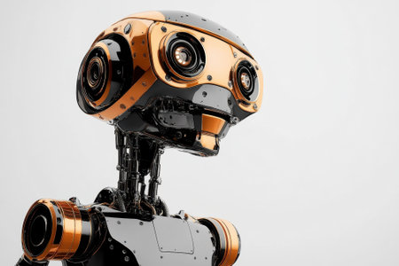 A robotic figure with large optics and a sleek frame stands out in a minimalist setting.