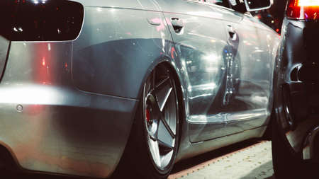 Luxury car with a illuminated taillights parked in a modern underground parking garage with wet reflective floors