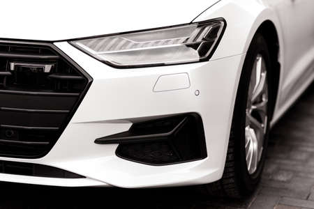 The headlamp of the new clean white sports car is of aggressive form with a part of the bonnet and black wheel, bumper.