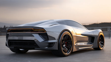 Sleek Gray Modern Supercar Elegantly Posed at Sunset with Dramatic Lighting