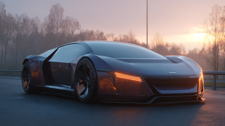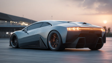 Sleek Modern Supercar with Glowing Taillights Stands Against a Sunset Sky