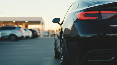 Sleek black car parked prominently in a dealership lot, reflecting the warm hues of the setting sun, showcasing its elegant design and polished finish amidst other vehicles