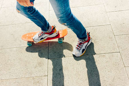 Young guy in ripped jeans standing with penny board in the park. summer activities skateboarding