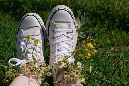 Feet in sneakers are standing on the grass, top view. Vertical photo, empty place for text.