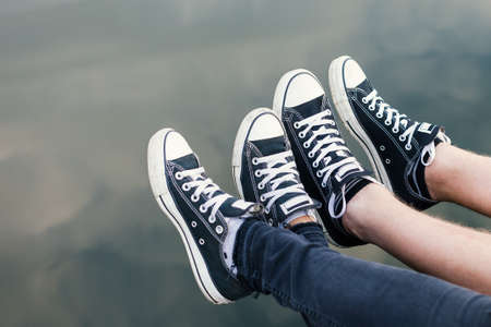 Legs and sneakers on the sea beach. Travel Lifestyle Summer vacations. Trendy concept.
