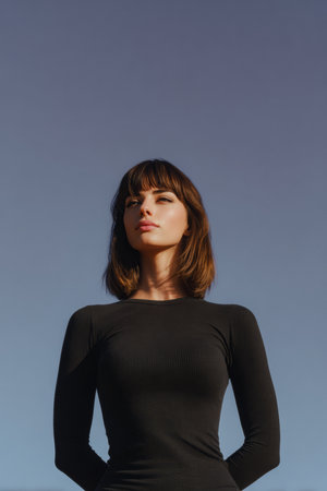 A young model stands confidently with her hands behind her back, dressed in a fitted black top. The clear blue sky and warm light create a calm atmosphere during golden hour.