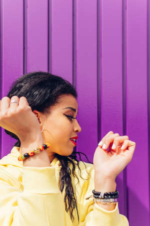 Portrait of the face of a young trap dancer, with yellow clothes and a purple background. African girl dancing relaxed current music outdoors.