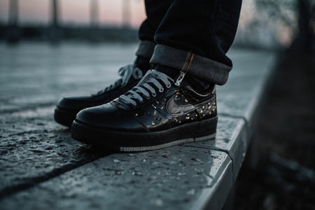 Pair of sneakers worn by athlete standing on track, preparing for athletic competition, symbolizing focus, energy, and physical effort.