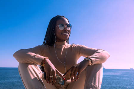 Portrait of goodlooking young African athlete wearing stylish shades and black outfit looking happy and cheerful sitting on sidewalks at sea waiting for his friend to joi : Generative AI