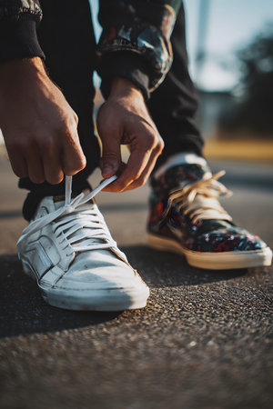 Close-up shot of a person's hands carefully tying the shoelaces of their sneakers on a textured asphalt surface. The image conveys a sense of preparation and self-sufficiency in an urban setting, highlighting a moment of focused personal detail.