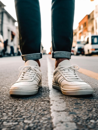 sneakers on ground, woman taking a walk on the summer road in sunny evening. top view at legs and shoes on ground asphalt. travel and vacation. exercise outdoors