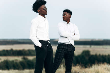 Two confident African American men, standing on the top of the mountain, climbing the rocks, businessman success, hiking on the peak of the mountain rocks at sunset, winner leader concept