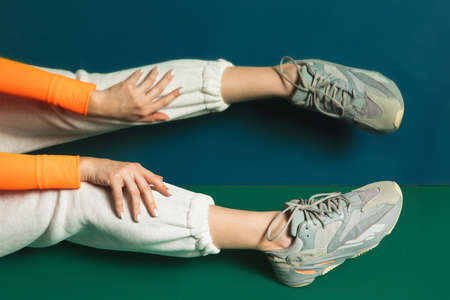 Legs in gray leggins and feet in pink sneakers on the rock with green background and leaves