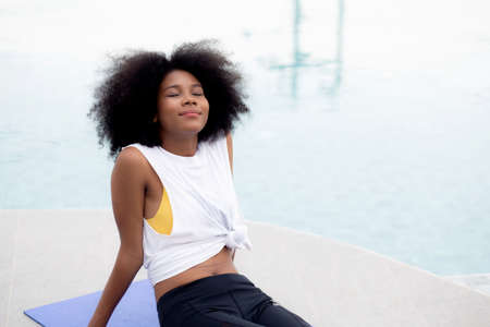 Young African American woman smiling in the poolside, female relax and leisure, vacation and summer, one person.