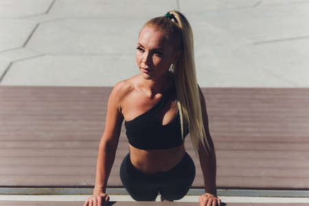 Fitness woman doing push ups Outdoor training workout summer evening side view Concept sport healthy lifestyle.