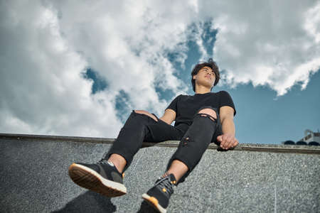 Stylish guy in black outfit looking away with serious expression while resting under blue cloudy sky on sunny day