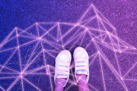 Wireframe feet walking away on road. Selfie foot walking shoes top view. Futuristic Metaverse NFT game background abstract blue pink neon. 3D Future modern digital technology concept.