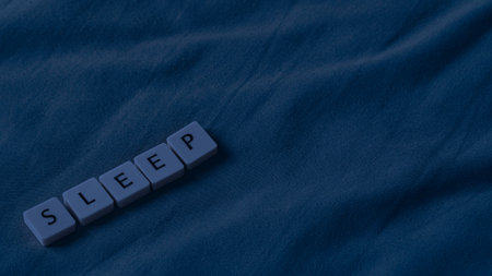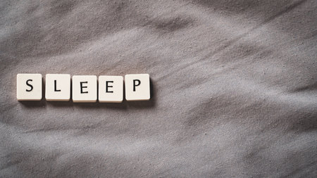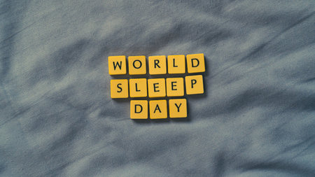 World Sleep Day concept with small lettered stones. Sleeping concept on a soft bed sheet. High angle view