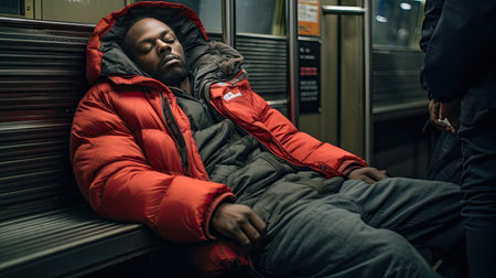 Homeless man sleeping on the bench in New York City subway station covered by own coat