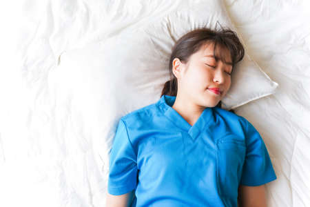 Young female nurse in blue uniform lying on the bed and sleeping.