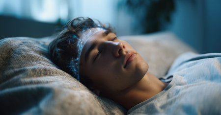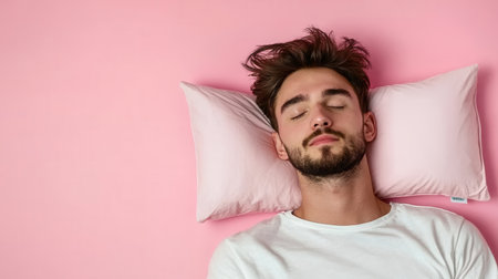 Man peacefully sleeping on a comfortable pillow in a cozy setting, showcasing relaxation and tranquility, sleep wellness concept
