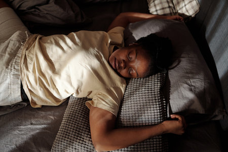 Close up of a young female with dark skin sleeping soundly in a cozy bed with soft light falling on her face