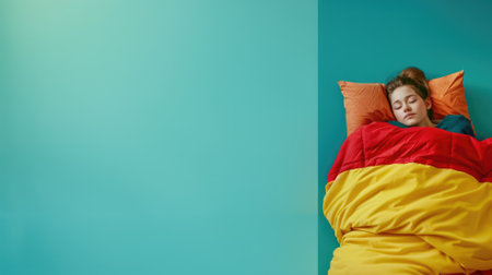 Woman asleep in bed with colorful bedding and two-tone wall