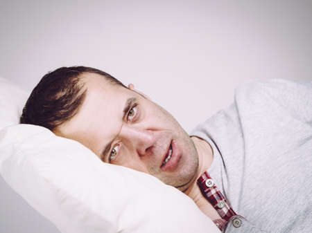 Tired man in bed trying to sleep but dealing with insomnia. Sleeping problems, guy having problem.