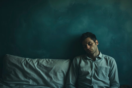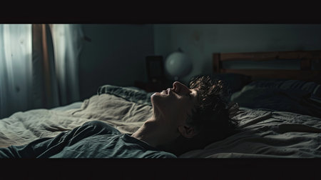 A solitary figure lies on a bed, gazing up at the ceiling with a blank expression, their eyes reflecting a sense of emptiness and despair.