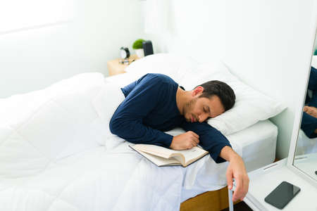 Sleepy man falling asleep while reading a book. Tired man sleeping next to an open book in his comfortable bed