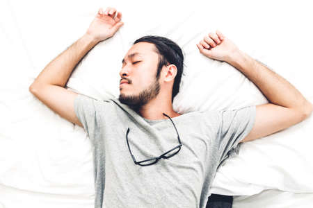 Tired man sleeping after work on a comfortable bed in his bedroom at home