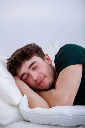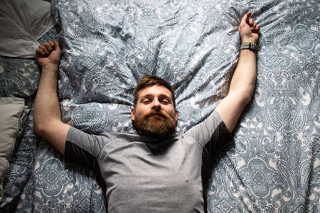 Sound sleep. Healthy lifestyle. Comfy softness of warm bed. Man sleeping peacefully. Calm and coziness.