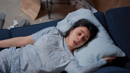 Worried desperate frustrated sad alone woman suffering from big depression, loneliness familly lost, crying lying in sofa feeling disappointment frustration pain vulnerable scared traumatised