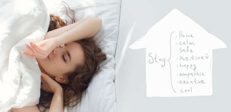 Stock photo - I stay at home awareness social media campaign and coronavirus prevention. Stay home phrase. Girl under the covers in her bed