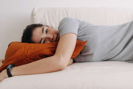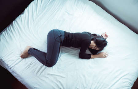 Asian woman depression have a headache and feeling sadness in bedroom,Top view