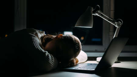 Tired woman. Hard working. Freelance job. Project deadline. Exhausted lady sleeping leaning hands on workplace with laptop table lamp light evening home interior dark window.
